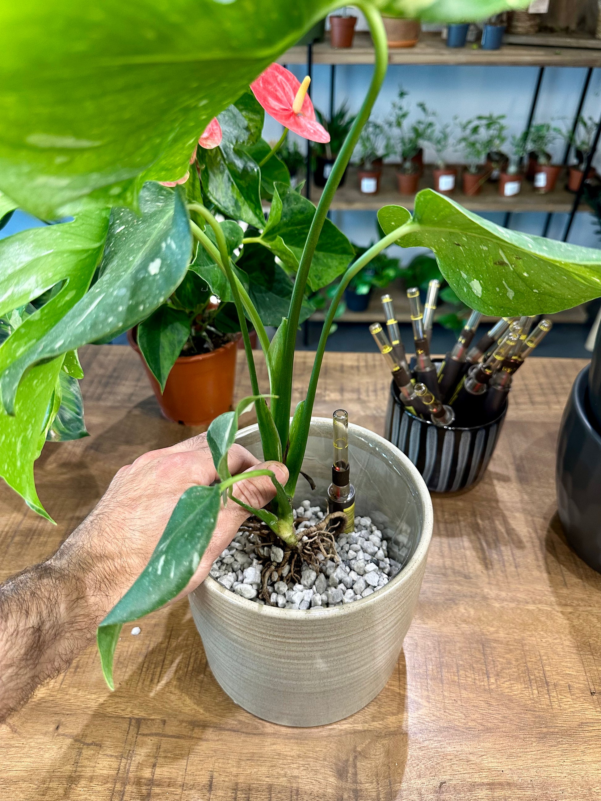 C’est à vous de jouer ! Après avoir sélectionné votre plante et votre cache-pot, vous la rempoterez en substrat minéral, guidé pas à pas. Vous apprendrez à installer un indicateur de niveau d'eau et à entretenir votre plante sur le long terme.